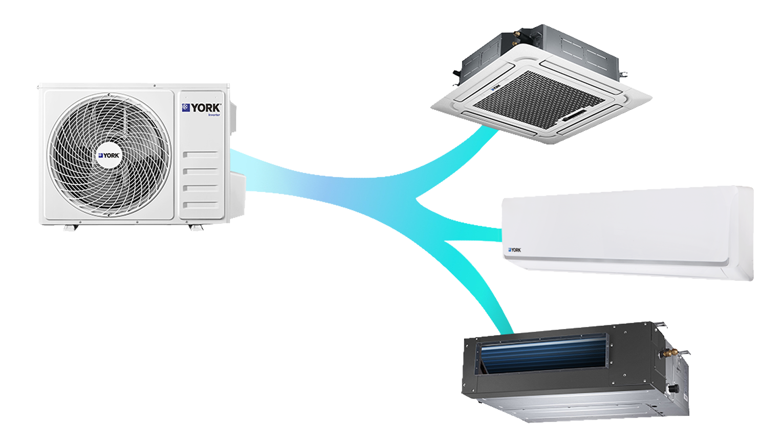 La línea de aires acondicionados Multi Split YORK® incluye una amplia variedad de tamaños para ofrecer mayor flexibilidad en sus productos. Cada modelo está diseñado para proporcionar comfort y eficiencia en una unidad fácil de operar, y el diseño estilizado se adecúa a una gran variedad de espacios, sea en el hogar o en la oficina.